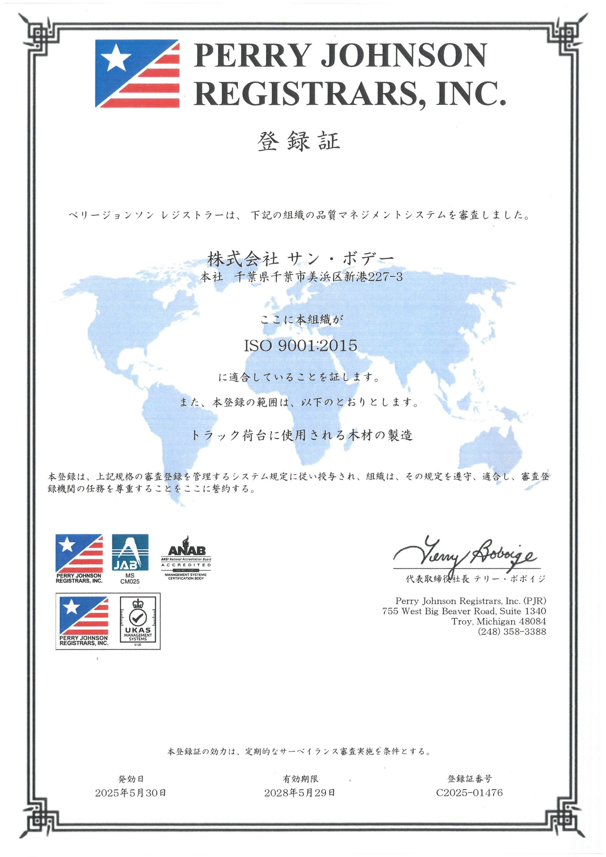 2022.09.21 株式会社サン・ボデーは2019年5月30日にISO9001:2015を取得しました。
